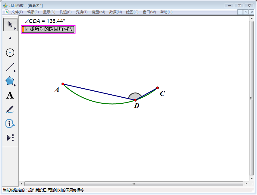11、得到下图。点击图中【同弧所对的圆周角相等】按钮,D点在圆弧AC上往复运动,在动画中可以看到线段AD、线段DC长度随着D点移动不断变化,但圆弧对应的圆周角∠ADC大小不变。