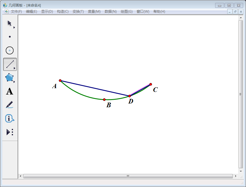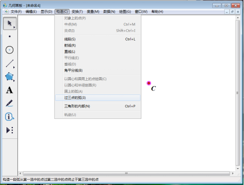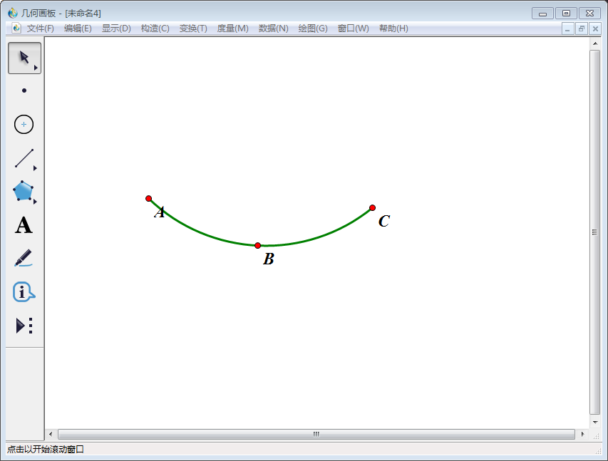 2、使用左侧工具栏中的【移动箭头工具】依次选中A、B、C三点,然后点击上方菜单栏中的【构造】,在其下拉菜单中选择【过三点的弧】。