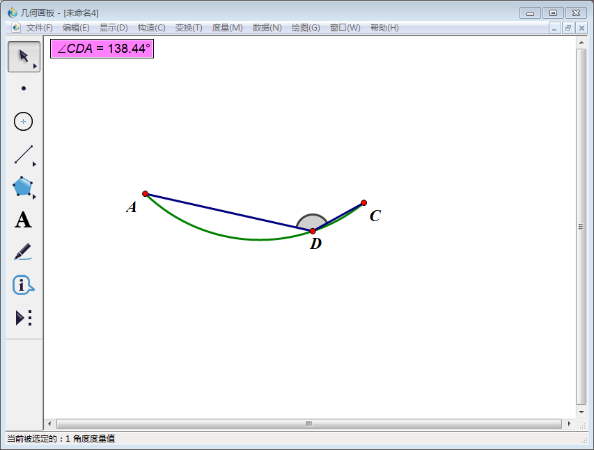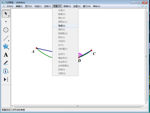 7、点击【移动箭头工具】,选中∠ADC的标记角,然后点击上方菜单栏中的【度量】,在其下拉菜单中选择【角度】,测量出∠ADC的大小。