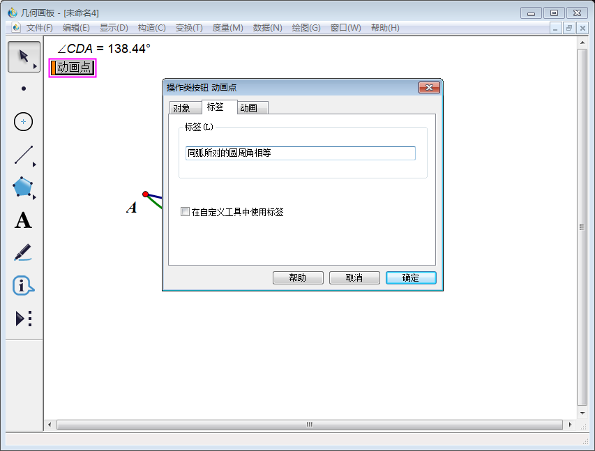 10、将标签选项修改为【同弧所对的圆周角相等】,然后点击【确定】。