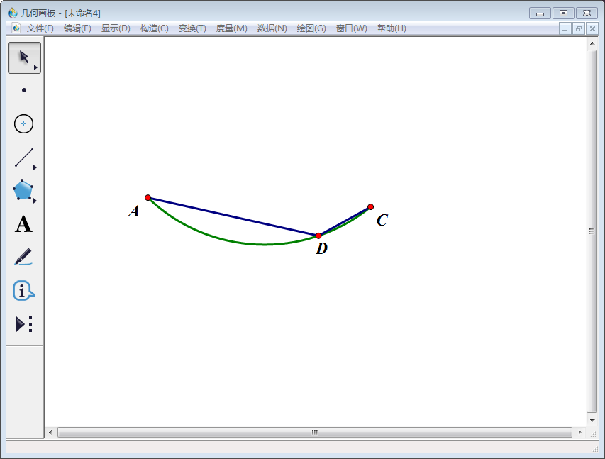 4、使用【点工具】在圆弧ABC上任取一点,标记为D(D点与B点不重合);左侧工具栏中的【线段直尺工具】,连接线段AD、CD,得到∠ADC。