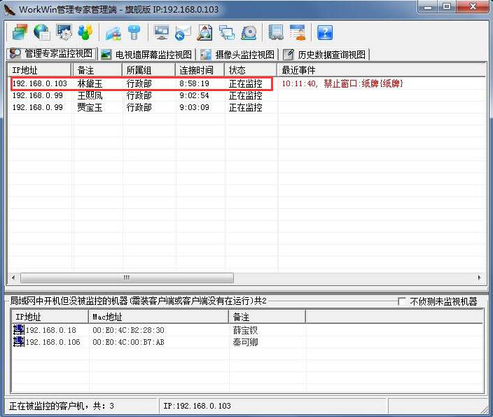 3、当员工尝试运行该娱乐程序时,上网行为管理软件WorkWin的管理端便会弹出被管理端被拦截的消息。