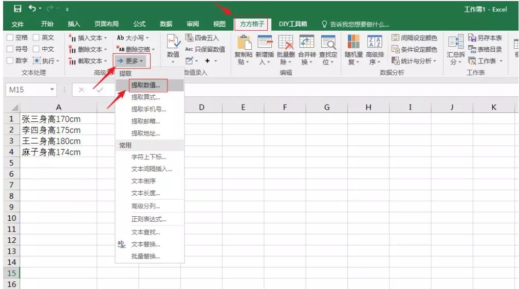 打开Excel表格文件,如图,依次点击【方方格子】——【高级文本处理】——【更多】——【提取数值】,