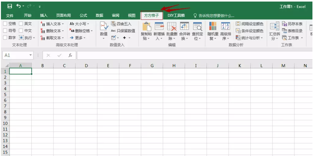 首先下载安装方方格子插件(安装之前必须关闭Office软件),然后打开Excel工作簿,如图,在上方菜单栏中找到【方方格子】,说明可以正常使用插件,