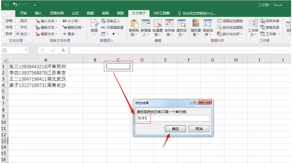 选择存放提取结果的单元格,点击确定,即可提取手机号码。