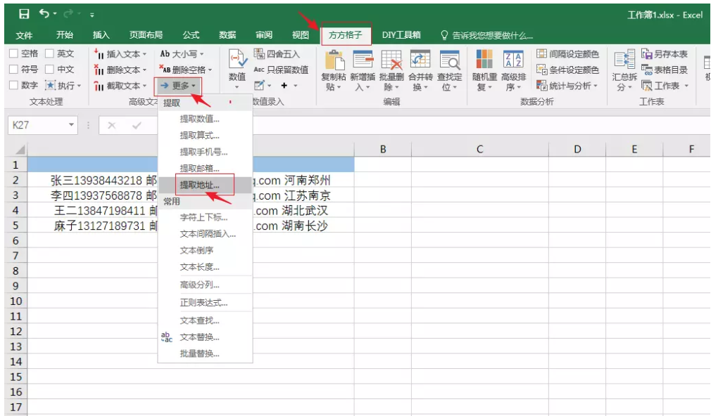 打开Excel工作簿,如图,在菜单栏中依次点击【方方格子】——【高级文本处理】——【更多】——【提取地址】,