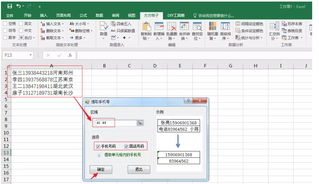 弹出对话框,点击【区域】,选择需要提取的单元格区域,勾选【手机号码】和【固定号码】,点击确定,