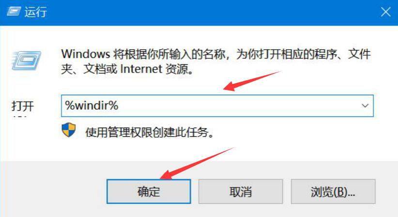 3、然后,按下键盘的“win+R”打开运行窗口,在文本框中输入“%windir%”,并点击“确定”按钮。