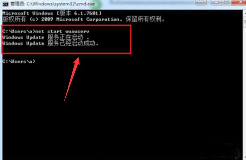 5、回到cmd的命令提示操作界面,输入“net start wuauserv”并按电脑enter键,启动Windows Update服务。