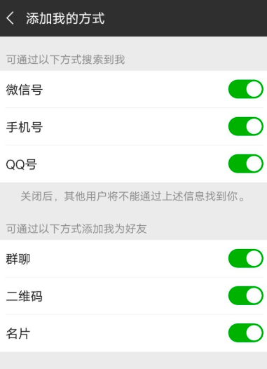 如图,微信默认通过群聊、二维码、名片的方式进行添加好友,你可以关闭这三个选项,别人就无法加你为好友。