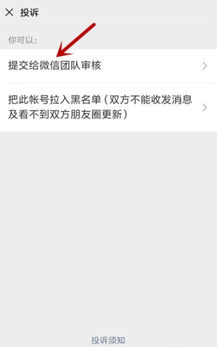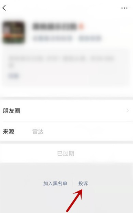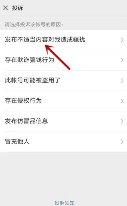 点击查看对方资料,如图,点击下方【投诉】,选择投诉原因,选择【发布不适当内容对我造成骚扰】,