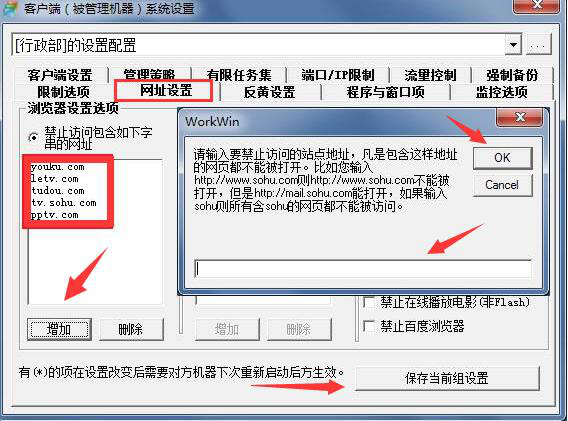 2、切换至WorkWin的“网址设置”设置界面。用户手动输入电影视频的网址,点击“OK”按钮,该网址便会生成至禁止访问的网址列表中。用户也可以点击“增加”按钮,增加更多的电影视频网站。这个也是设置WorkWin禁止局域网看电影视频的常用方法。