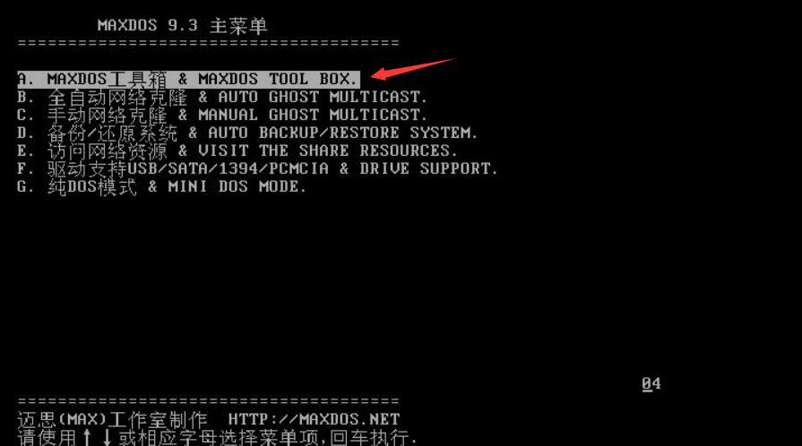 2、然后,在3主菜单中,点击“A.MAXDOS工具箱&MAXDOS TOOL BOX.”选项,按电脑键盘的Enter键确定执行该命令。