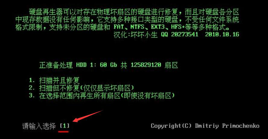 6、接着,输入选择“1”,硬盘修复软件HDDREG执行扫描并修复的指令。