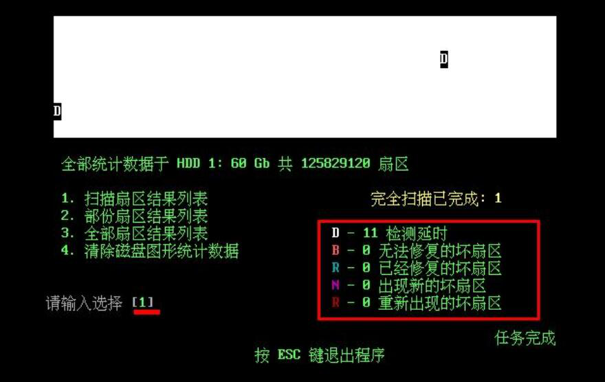 8、最后,用户可以在如下图的白色编辑框中,输入相应的编号,例如输入“D”,硬盘修复软件HDDREG便会将检测延时的结果展示出来。当按键盘的ESC键的时候就可以退出硬盘修复软件HDDREG。
