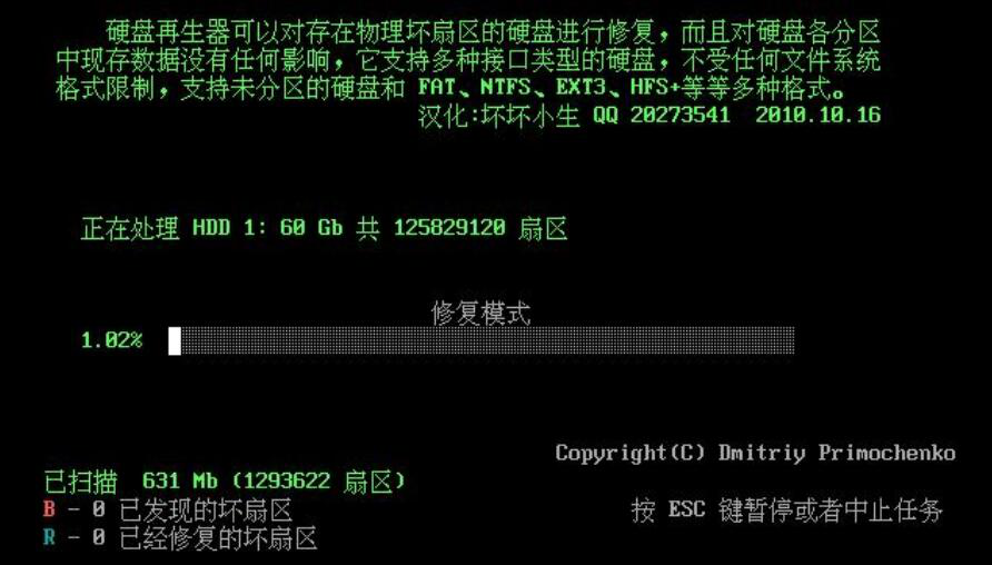 7、此时,硬盘修复软件HDDREG修复模式启动,用户便可以实时了解到修复的具体进度。