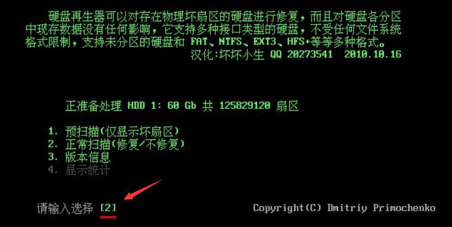 5、在处理该扇区的时候,用户输入“2”,硬盘修复软件HDDREG便执行扫描的指令。