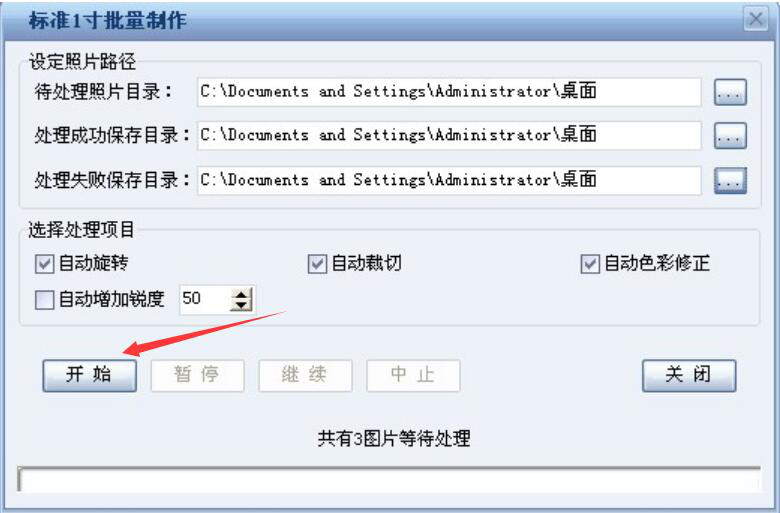 3、然后,证照之星会弹出标准1寸批量制作的窗口,用户设定照片的路径,勾选“自动旋转”、“自动裁切”、“自动色彩修正”,点击“开始”的按钮,证照之星便开始执行批量制作的指令。