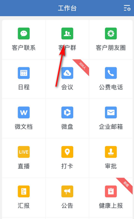 打开企业微信,进入主界面,点击下方【工作台】,然后点击【客户群】,