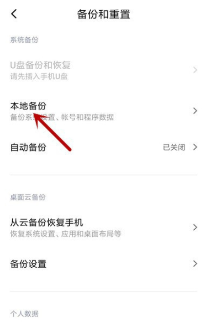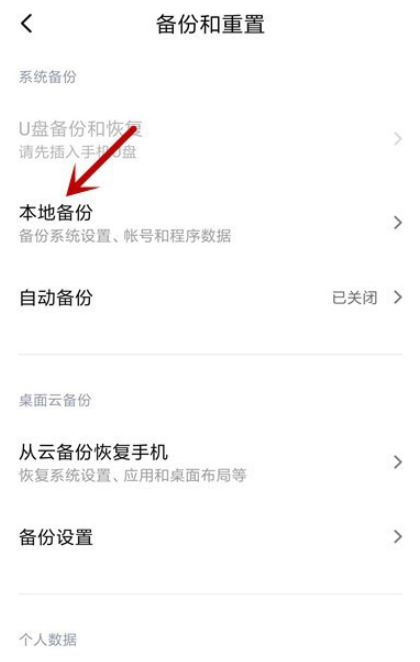 进入以下界面,找到并点击【备份和重置】,选择【本地备份】功能,