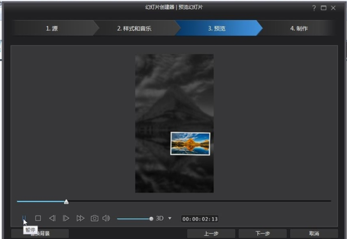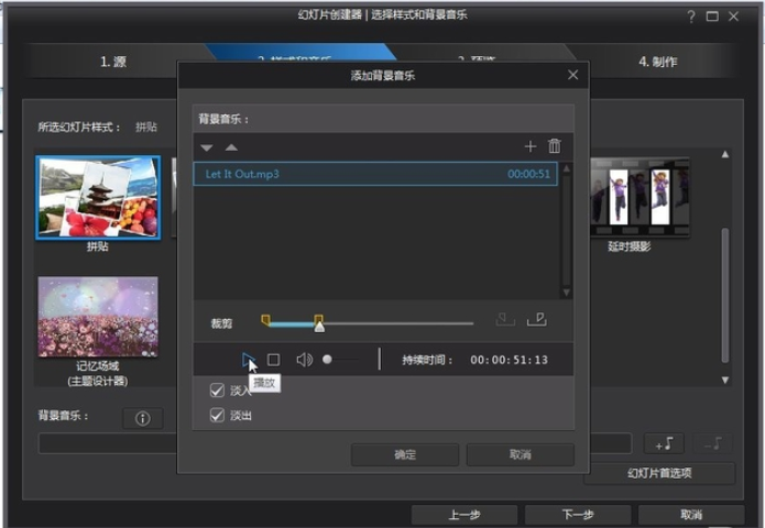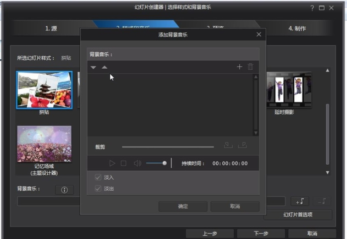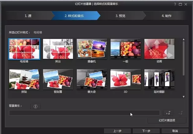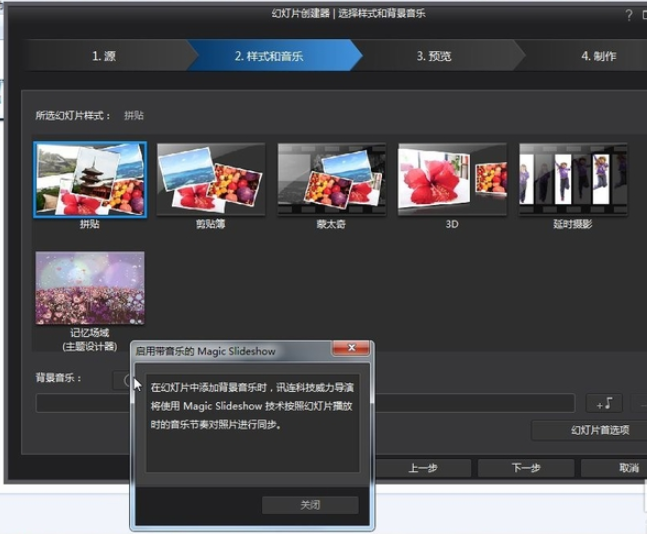 4、现在开始第二个步骤,点击【样式和音乐】,威力导演提供了丰富的幻灯片模板资源,大家选择自己喜欢的幻灯片样式,