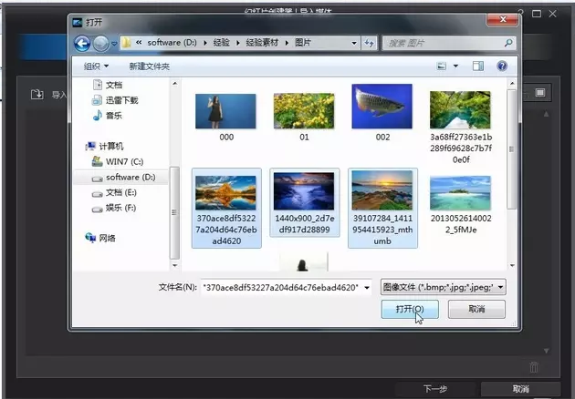 3、出现对话框,选择用于制作幻灯片的图片素材,点击【打开】,将其导入,进行下一步,