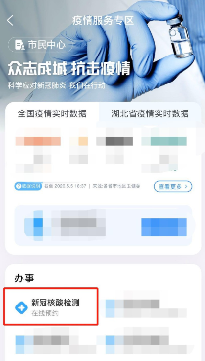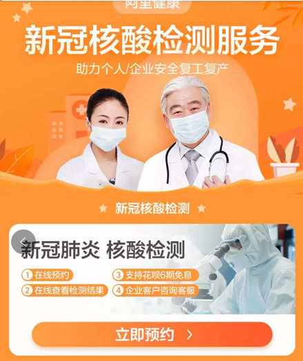 进入疫情服务专区,如图,点击【新冠核酸检测】,然后点击【立即预约】,