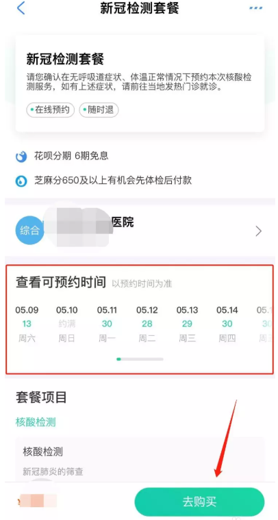 点击查看套餐情况,预约时间,点击【去购买】,成功付款,即可在约定时间去医院进行新冠核酸检测。