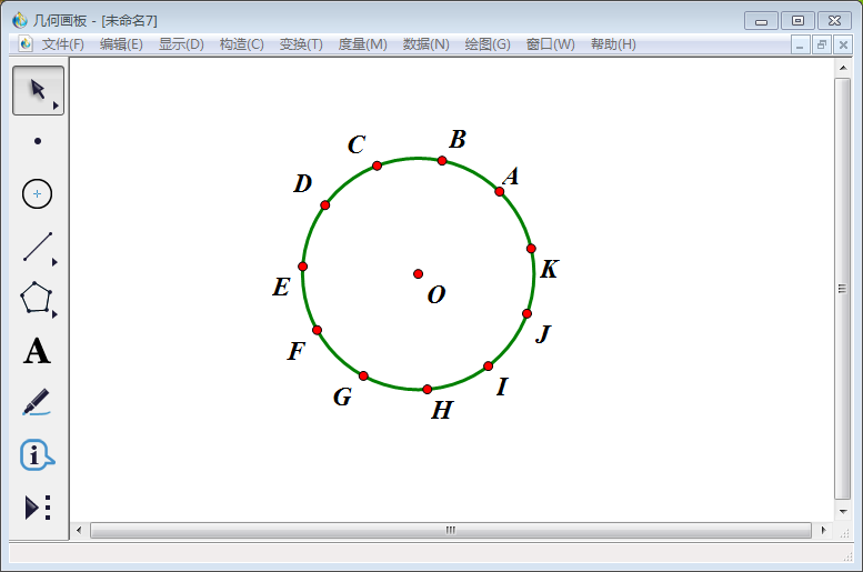 4、同样的操作使用【移动箭头工具】选中上步操作中得到的新点B,然后点击【变换】—【旋转】再得到一个新点C;如此操作得到剩下的十一等分点,分别标为D、E、F、G、H、I、J、K;使用几何画板十一等分圆就完成了。