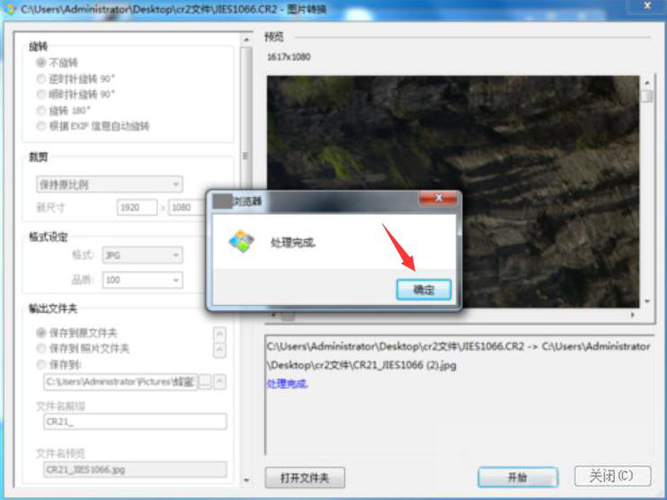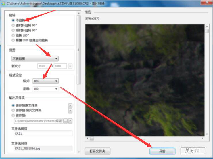 4、接下来,在Honeyview的图片转换操作左侧栏中,根据自己的需要,对“旋转”、“裁剪”、“格式”、“输出文件夹”、“文件名”进行设置,设置完成后点击右下方的“开始”按钮,Honeyview便开始执行将将cr2图片转化为jpg格式的指令。