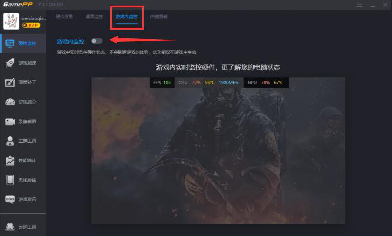 4、接下来,切换至桌游模拟器游戏加加的游戏内监控的设置页,将游戏内监控开启。