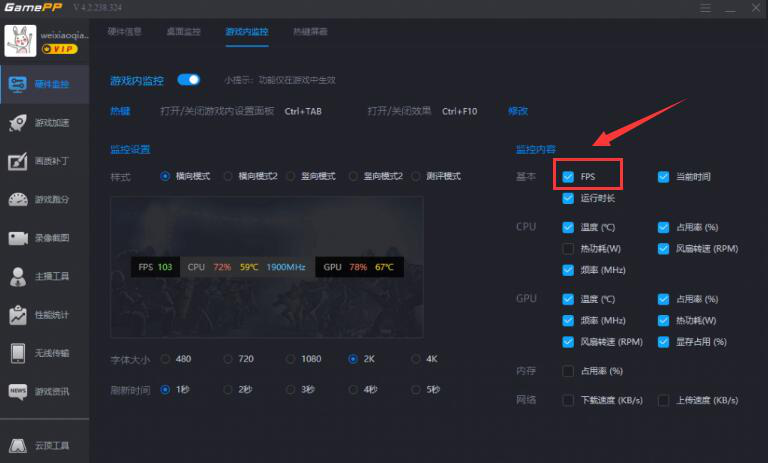 5、用户想要桌游模拟器游戏加加在游戏中显示帧数,那就将游戏内监控的“监控内容”中的“FPS”选项勾选。