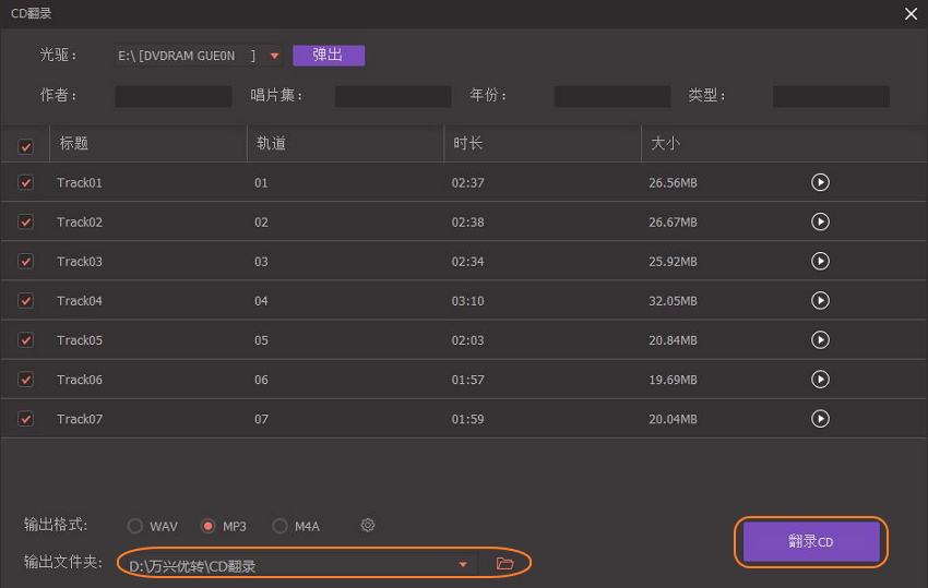 点击【CD翻录】,此时会弹出一个窗口,提示插入CD,将CD连接到电脑,这里会显示所有音频文件,选择需要转换的音频文件,单击播放按钮,进行预览,