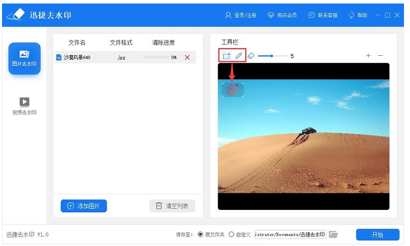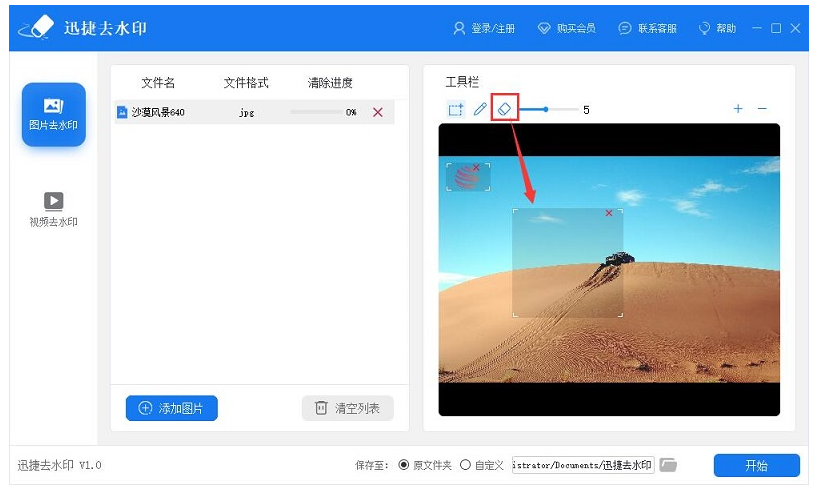 选好工具,用它标记出图片中的水印区域,若标记出错,你可以点击橡皮擦进行修改,然后设置图片导出目录,