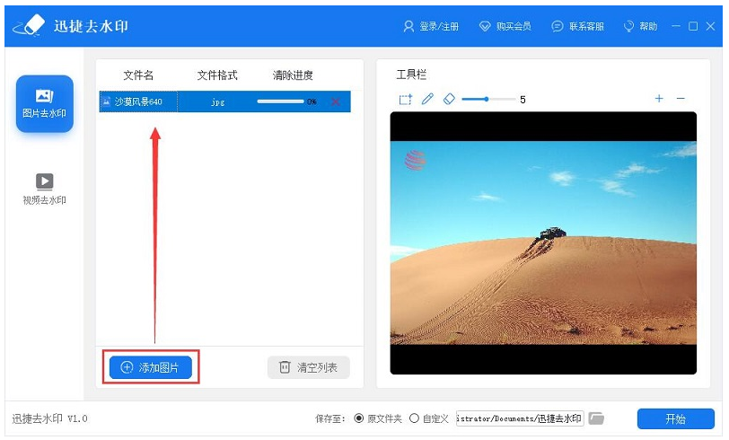 下载安装迅捷去水印软件,打开软件,进入主界面,选择【图片去水印】功能,该软件还提供了视频去水印功能,有兴趣的用户可以试一试,