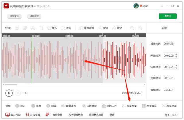 音频文件添加成功,选择需要处理的音频片段,点击【改变节奏】功能,