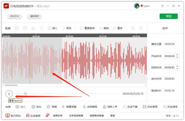 如图,刚刚选中的音频段落发生了变化(缩小),点击播放,试听效果,