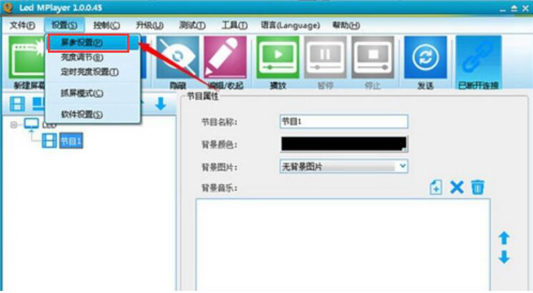 2、节目属性设置完成,用户点击LED演播室菜单栏“设置”中的“屏参设置”。