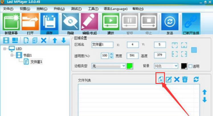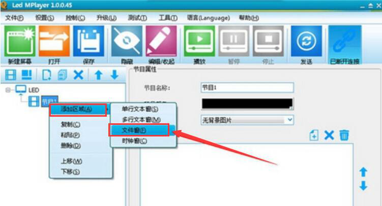 4、接下来,在LED演播室的界面中,右键单击自己新建的节目,在其子菜单中依次点击“添加区域”、“文件窗”。