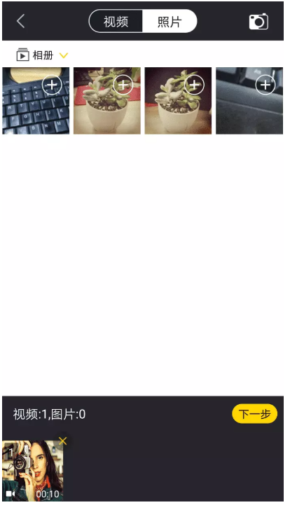 3、打开手机相册,选择需要处理的视频,选好之后,点击下一步,