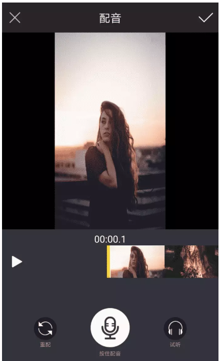 6、如图,直接点按底部的【按住配音】按钮,即可进行配音,配好之后,你可以点击试听,查看效果,如果觉得不满意,还可以点击【重配】,是不是很方便呢?