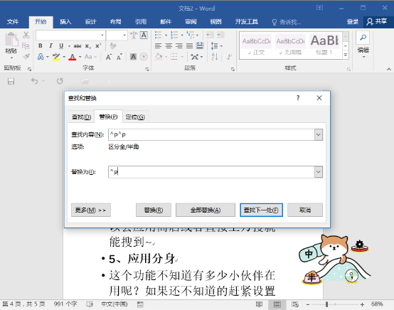 转换后的文档可能存在空行,使用替换功能删除空行,使用快捷键【Ctrl+H】,打开查找替换功能,替换【^p^p】为【^p】,一直点击【查找下一处】,至无法替换为止。