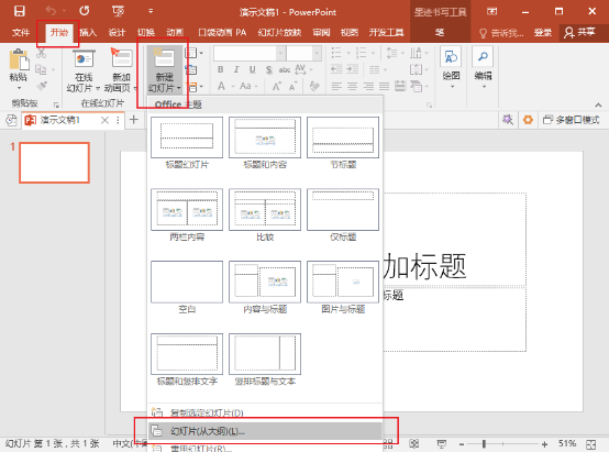 3、接着新建一个PPT文稿,在菜单栏中点击【开始】——【新建幻灯片】,选择【幻灯片(从大纲)】,插入刚才修改的Word文档,如图,所有内容已经完美“复制”,秒变PPT!