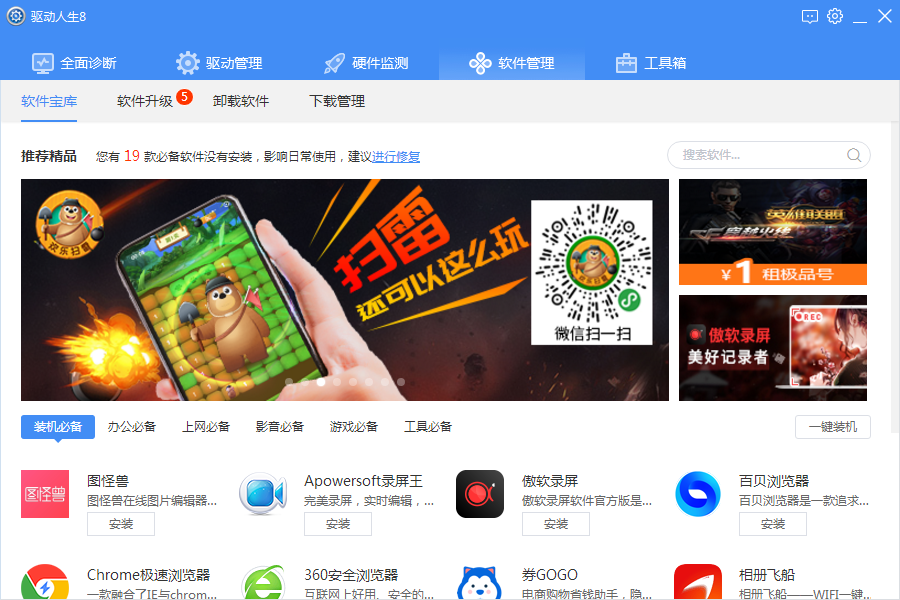 4、软件管理。延续了之前版本的功能,用户可以在这里安全的下载软件,及时更新和卸载电脑上安装的软件,十分的方便可靠。