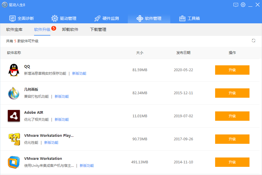 2)软件升级:点击【软件升级】—显示可升级软件列表—点击需升级软件对应【升级】。