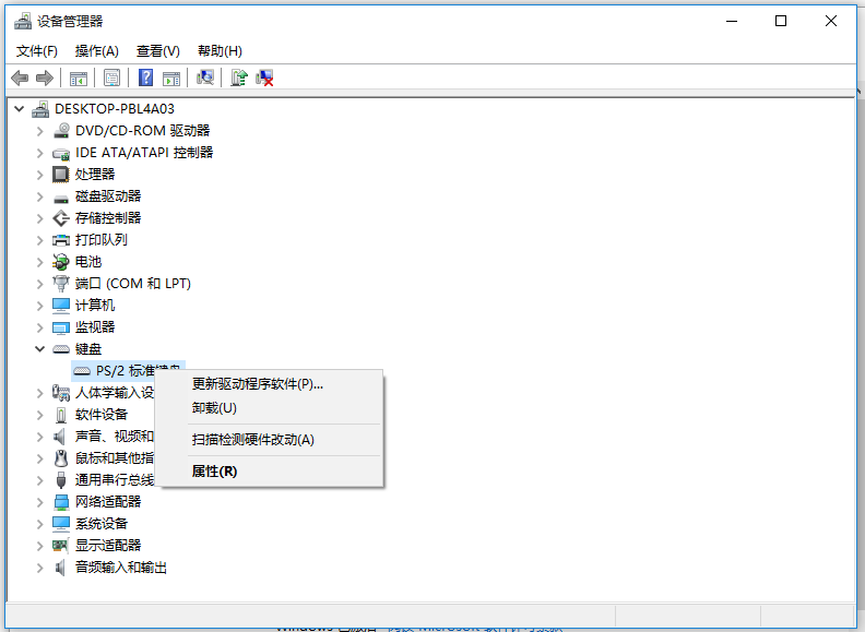 打开设备管理器,如图,点击展开【键盘】选项,找到【PS/2标准键盘】,