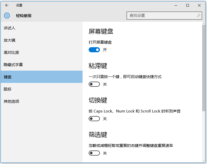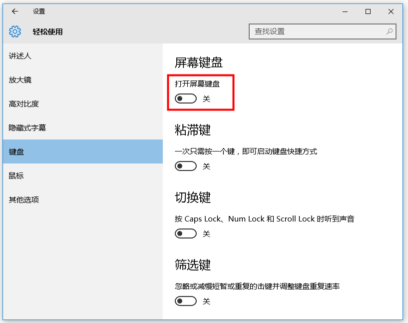 进入以下界面,如图,在左侧栏点击【键盘】,然后在右侧窗口点击【打开屏幕键盘】,