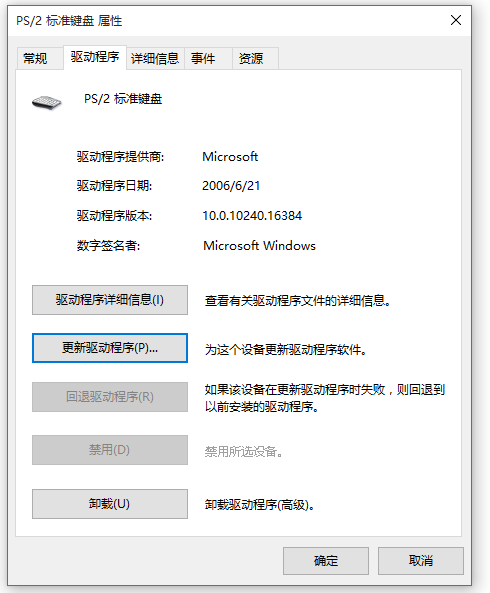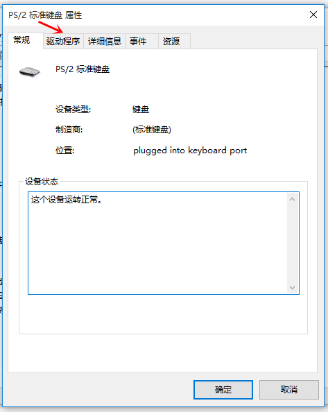使用鼠标右击【PS/2标准键盘】,弹出菜单,选择【属性】,进入属性面板,点击【驱动程序】,