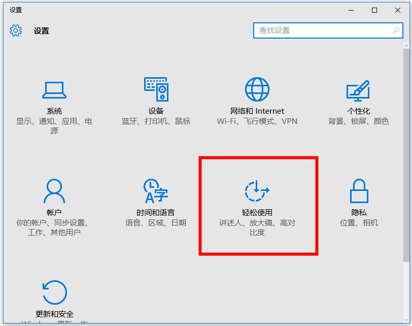 呼出开始菜单,点击【设置】,进入Windows设置面板,如图,点击【轻松使用】,