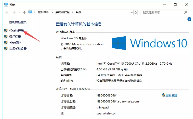 如图,使用鼠标右击【此电脑】,弹出菜单,选择【属性】,进入系统窗口,在左侧点击【设备管理器】,